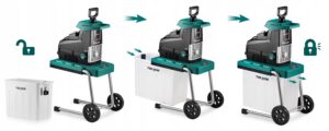 Rozdrabniacz frezowy z koszem | Średnica gałęzi aż 44 mm | Wpinany kosz (box) o pojemności aż 60 l | Moc max 3500 W | Sekator w zestawie | Uchwyt na popychacz | Prędkość obrotowa 60 rpm | Bardzo cichy | Energooszczędny | Panel sterowania | Zabezpieczenie przed przeciążeniem | Bieg wsteczny | Hamulec bezpieczeństwa | Uchwyt transportowy